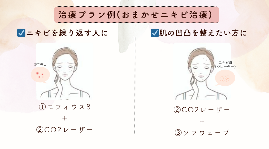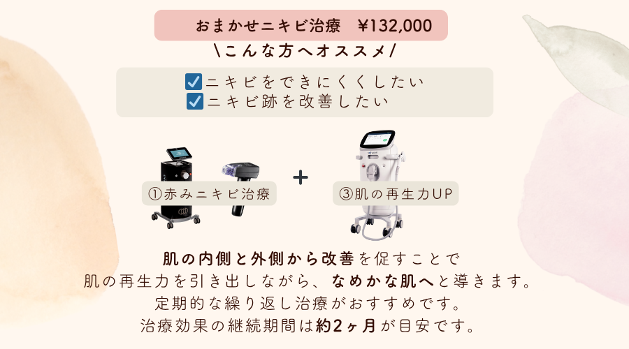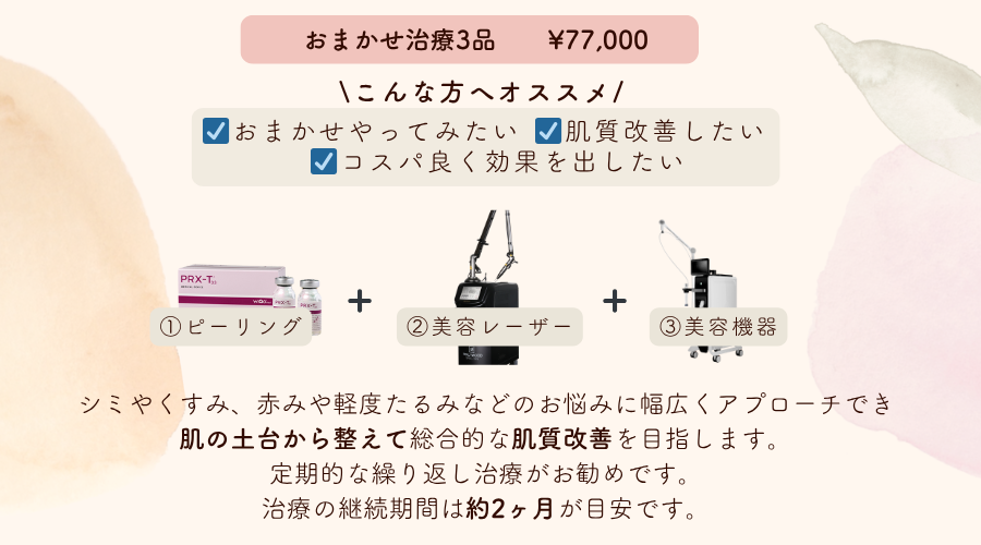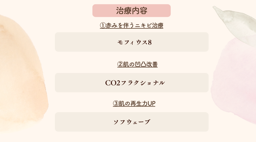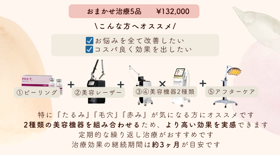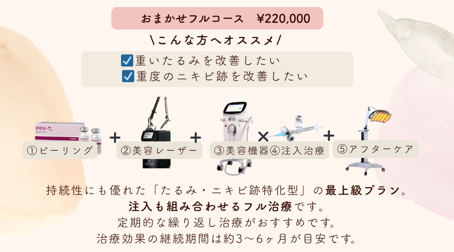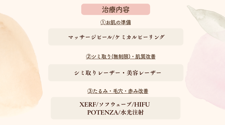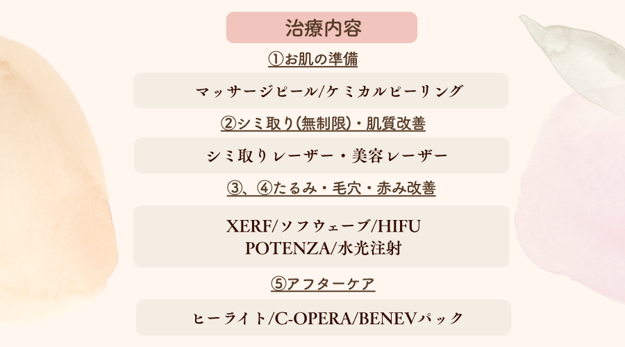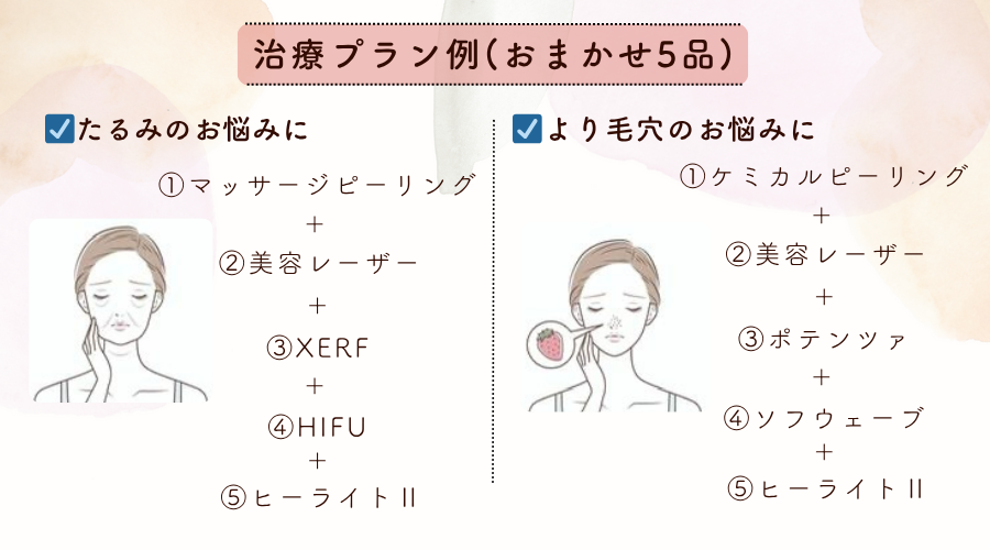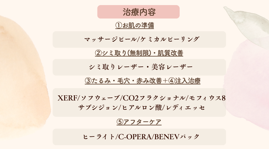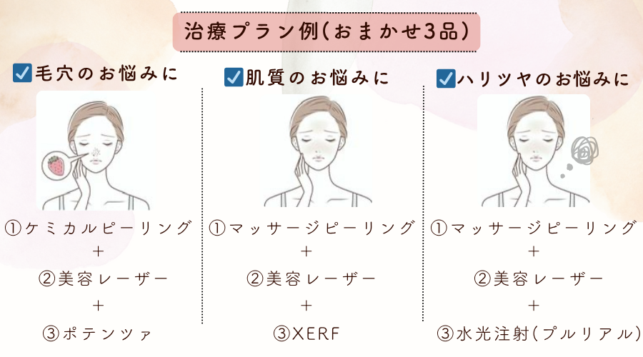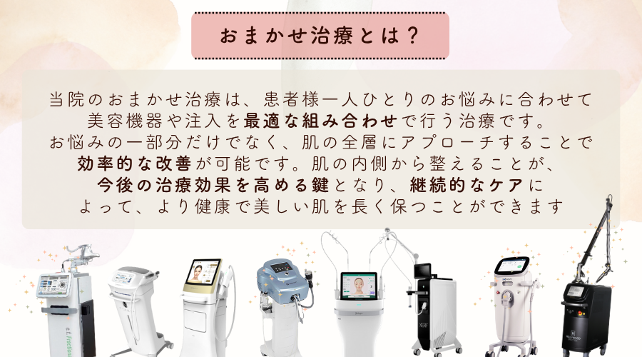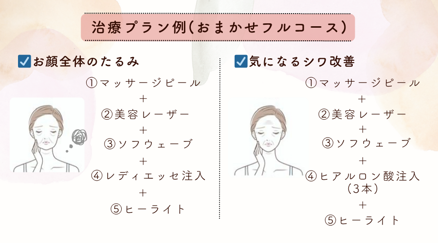 上記メニューの中より、お悩みに合わせて美容機器と注入治療組み合わせて施術致します。